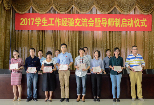 11月17日,诚毅学院举办2017学生工作经验交流会暨导师制启动仪式。学院院长叶光煌、党委副书记连志崧、院长助理陈三明、教务部主任黎世学出席,学工部、就业办、团委全体人员,各教学院系党总支书记、系办主任、全体辅导员、导师代表们参加会议。