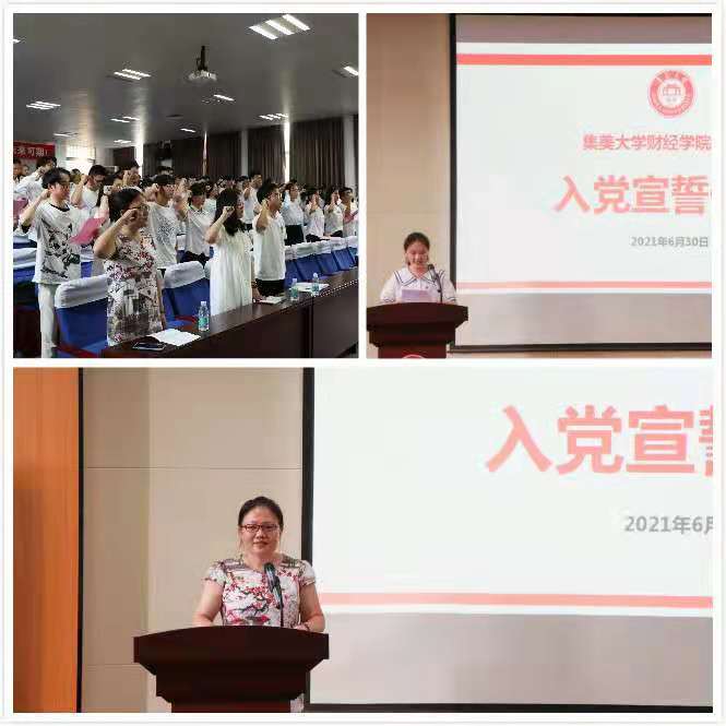 6月30日下午,财经学院在财媒体三楼多功能厅举行新党员入党宣誓仪式。院党委书记兰莉芸、党委组织员、各学生党支部书记及全体新党员参加仪式,仪式由院党委副书记李海川主持。