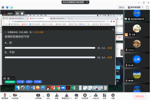 9月20日下午,马克思主义学院原理党支部通过腾讯会议平台面对全院新教师开展志愿者服务活动,成功举办了线上技能培训会。支部党员梅进禄作为代表发言,他认为教师在线上课程前应熟悉教学平台做好充足准备,同时线上线下的课件应该有所区别,并通过练习、互动、分享材料等方式做好线上、线下的衔接,在直播过程中尽量打开摄像头,少开窗口页面,为同学们创造良好上课体验。支部党员姚庐清做课堂派技巧示范,她从互动答题、线上板书及平时考勤等方面详细分享了自己的线上教学经验。