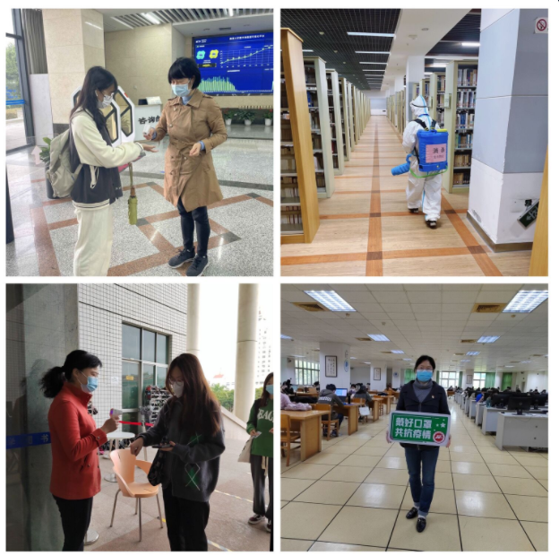 当前疫情形式严峻复杂,图书馆通过召开疫情防控工作专题会议,学习常用各级疫情防控相关文件等形式,传达号召全馆职工响应省、市及学校应对新冠肺炎疫情工作指挥部关于疫情防控工作的最新精神和校领导指示,增强疫情防控意识,严格落实好学校各项防控工作要求,坚决守住图书馆疫情安全底线,保障师生读者的健康安全。疫情期间,图书馆职工和学生志愿者每天轮流排班在图书馆门口协助物业人员做好入馆测温、验码等各项工作;及时发布延期还书通知,让读者安心利用所借图书;全力保障数字信息资源的正常运行,并积极开展各种线上服务,为全校师生疫情时期的网络教学、科研工作和自主学习提供有力保障。