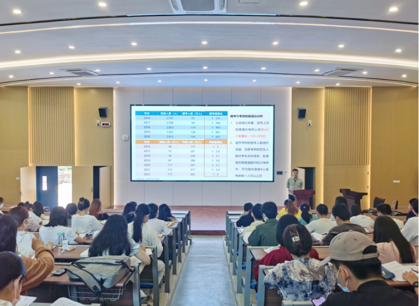 主讲人袁竟成老师从解析考研大数据、考研学习时间轴、考研各科备考重难点三个方面展开,通过举例和分析历届录取分数线让同学们了解当前的考研形势,同时就如何择校选专业、如何准备研究生各阶段考试、如何安排学习时间提出许多建议。