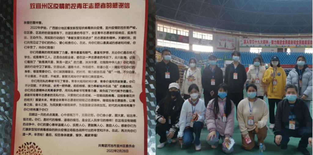 同样是在春节的伊始,广西壮族自治区河池市同样遭受了疫情的侵袭,刚刚结束大学第一个学期的雷梓慧同学没有犹豫,主动选择了成为一名志愿者,只想为了家乡抗疫做出⼀些力所能及的事情。经过工作人员的培训帮助,她每天早上八点准时来到体育馆,拿上核酸检测登记码,指导前来做核酸的群众如何在手机上登记信息、查询结果,并对人群进行分流、现场疏导以及排队秩序和间距的严格监督,为有困难的老少及残疾人提供帮助。面对单调反复的工作,她用耗不完的耐心与不熄灭的热情解决群众们一个又一个的问题。