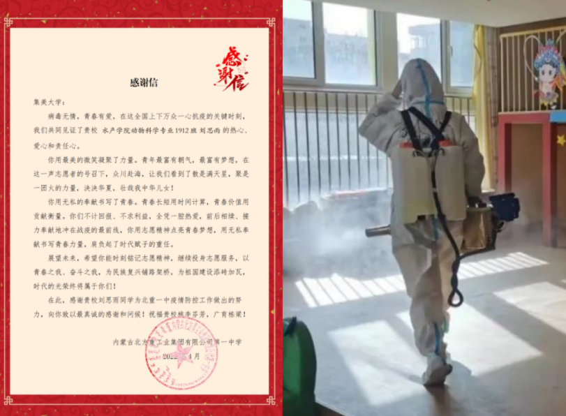 近日,水产学院分别收到了来自内蒙古北方重工第一中学和共青团河池市宜州区委员会的来信,信中表达了对我院动科1912班刘思雨同学和养殖2114班雷梓慧同学的感谢,赞扬她们在家乡需要时挺身而出,自愿站上防疫工作的前线,为疫情防控做出积极贡献的优秀事迹。