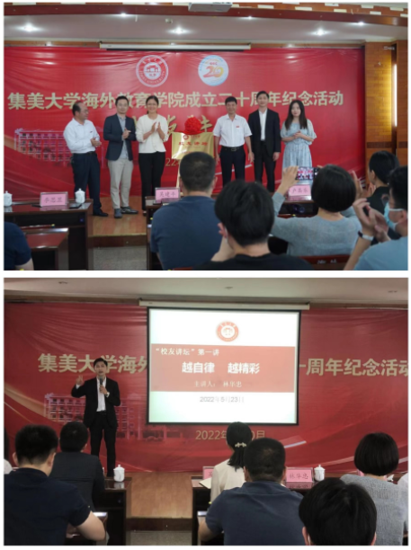 在仪式上,学院领导与校友代表共同为“校友讲坛”揭牌,并为中美合作办学库克项目2014届校友林华忠颁授“海外教育学院成立20周年校友讲坛主讲嘉宾”聘书。林华忠校友现任莆田永丰鞋业有限公司董事长。企业荣获2022年“全国五一劳动奖”。他在启动仪式后作了题为《越自律·越精彩》的专题讲座,分享在校期间担任学生干部的工作经验,畅谈创业心得体会。他鼓励在校学生要明确目标,做好生涯规划;珍惜时光,勤学向上增长才干;弘扬嘉庚精神,不忘服务社会,在青春的赛道上跑出最好成绩。