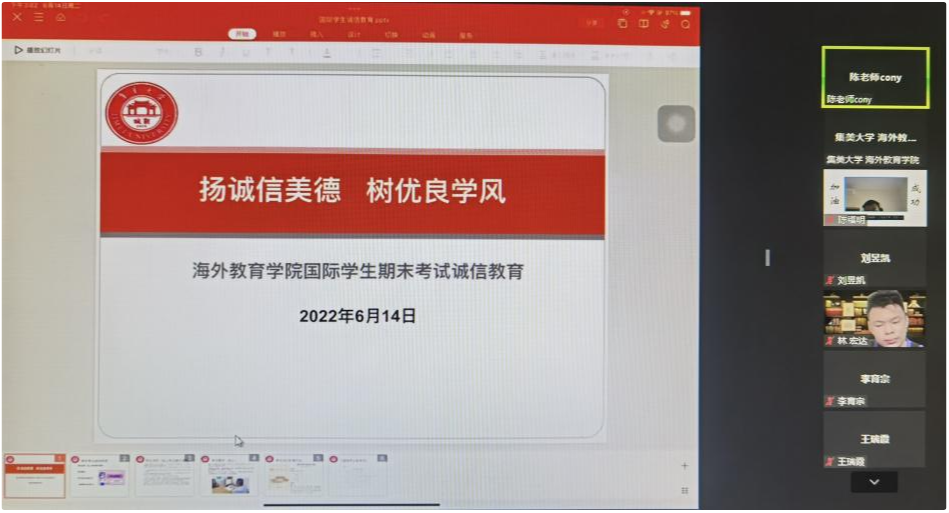 6月14日,海外教育学院组织开展国际学生“诚信考试”主题教育大会。会议在线上进行,全体国际学生参加此次会议。