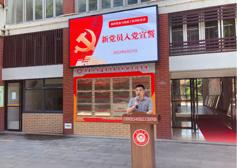 6月25日上午,海洋装备与机械工程学院举行了新党员入党宣誓。学院党委书记陆宝忠领誓并讲话,学院党委副书记谢杰云主持,学院党委组织员和各党支部书记出席。