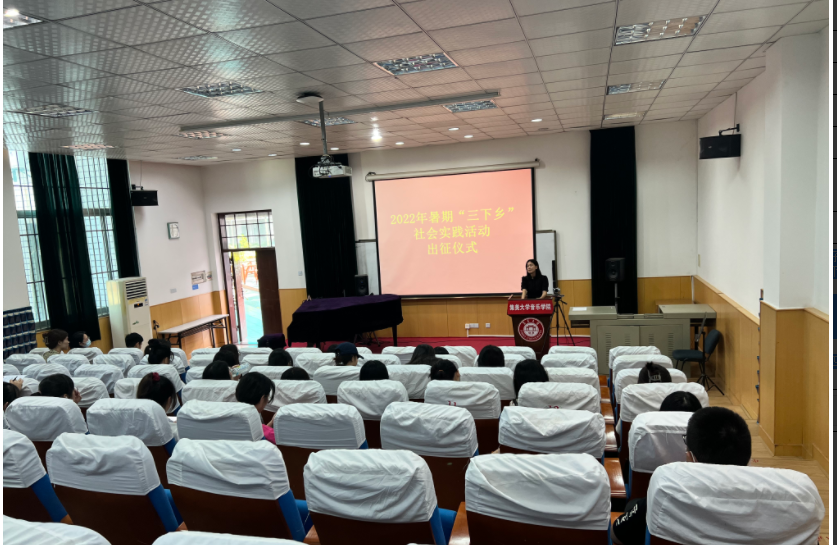 为深入学习贯彻习近平总书记在庆祝中国共产主义青年团成立100周年大会上的重要讲话精神,引导和帮助广大青年学生上好与现实相结合的“大思政课”,在社会课堂中“受教育、长才干、作贡献”。6月28日下午,音乐学院召开2022年暑期“三下乡”社会实践活动出征仪式,学院党委副书记洪妍妮、院团委书记、实践队指导老师及全体实践队员参加了本次出征仪式。