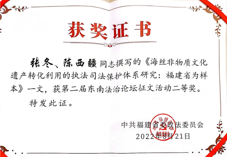 海洋文化与法律学院张冬教授与程国琴副教授撰写的论文《海丝非物质文化遗产转化利用的执法司法保护体系研究》《金融司法与金融监管的协同治理研究》分别荣获第三届东南法治论坛二等奖,并在“产权与知识产权保护”和“防范化解经济金融风险”论坛中进行主题报告。