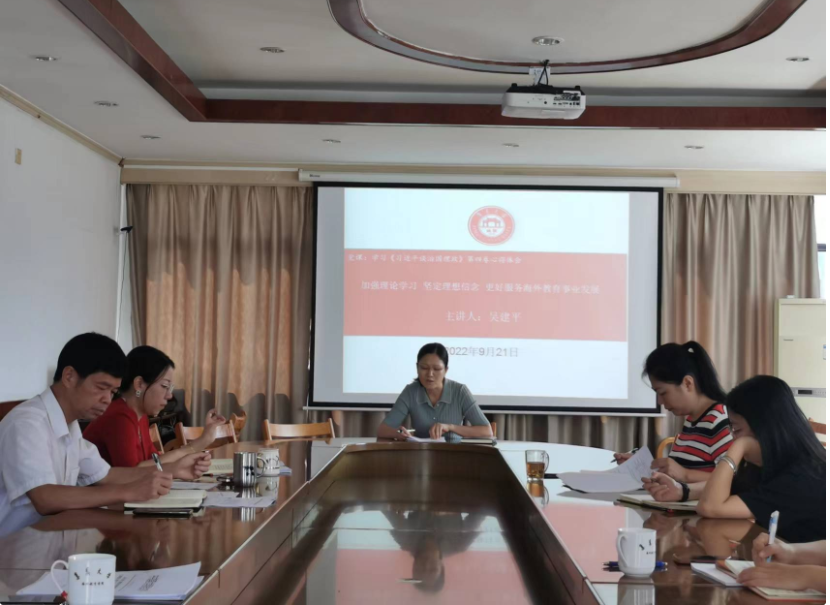 9月21日,海外教育学院党委召开中心组理论学习交流会,专题学习研讨《习近平谈治国理政》第四卷。学院中心组成员及各科室负责人、支部书记参加了会议。