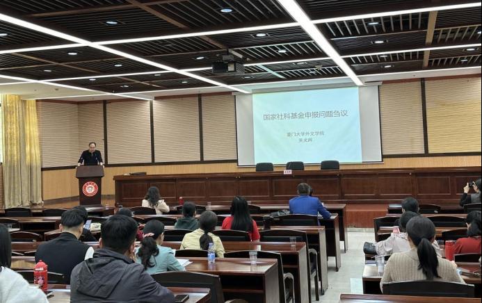 3月27日下午,外国语学院第58期“集大外语学术沙龙”活动于尚大楼103拉开帷幕。厦门大学吴光辉教授应邀主讲“国家社科基金申报问题刍议”专题,学院骨干教师以及2023级研究生参加,任江辉教授主持。
